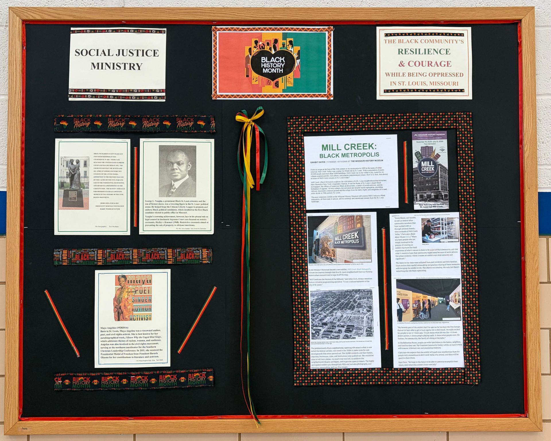 This February, for Black History Month the Social Justice Ministry is highlighting the resilience and courage of the black community in St. Louis, especially in the face of various forms of oppression. The display in the Social Hall includes Dred and Harriet Scott, George L. Vaughn, Maya Angelou, and Mill Creek Valley.
